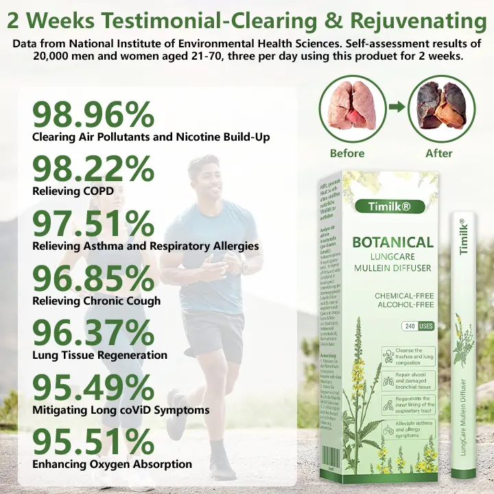 עם 99% מהאנשים שנחשפו לזיהום אוויר מסוכן, תמיכה בדרכי הנשימה מעולם לא הייתה חיונית יותר. אם אתה מעשן לשעבר שעדיין נאבק בשיעול המתמשך הזה, או עייף מפתרונות יקרים שהבטיחו הכל, אבל לא סיפקת כלום. רוב האנשים מבזבזים מאות על מוצרים שבקושי עובדים מכיוון שהם מסתמכים על מנגנון מסירה שגוי. אבל מה אם יש data-start="478">גישה קליניתו0> קלינית0 data-start="525">2 דקות במקום 90 דקות? Timilk® Botanical LungCare Mullein Diffuser הטכנולוגיה המתקדמת של שאיפת האף מספקת תמצית מוליין מרוכזת ישירות למערכת הנשימה שלך תוך 2 דקות — תמצית מוליין מרוכזת ישירות למערכת הנשימה שלך תוך 2 דקות — באמצעות העברת נתונים של <strong data-end="743" לגמריומגיעים לריאות שלך לאן שאתה הכי צריך את זה.