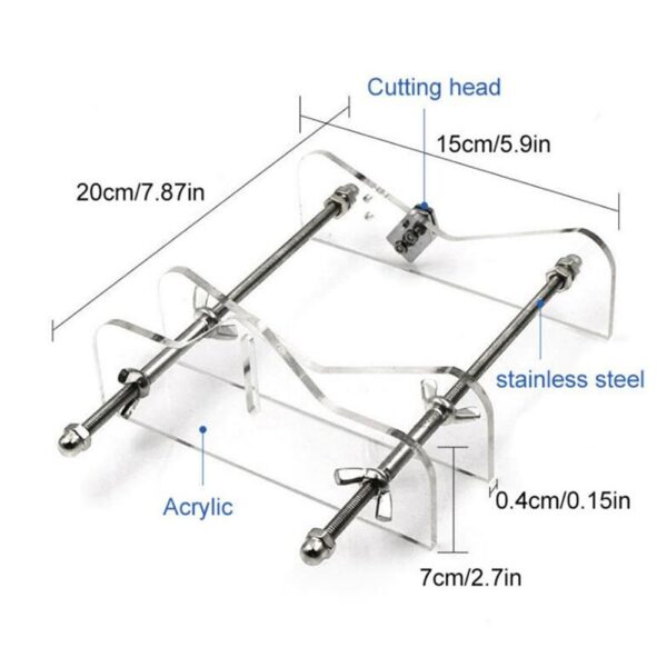 1. בקבוק מיקום- הבקבוק מונח לאורכו על החותך עם סמיכות תחתית כנגד המעצור האחורי ונשען על הגלילים. המיקום של המעצור האחורי והגלילים האחוריים קובע את הנקודה שבה אתה חותך את הבקבוק. כדי להתאים את האורך, שחרר את הבורג והחלק את המעצור האחורי והגלילים קדימה לחתוך קצר יותר ולאחור לחתוך ארוך יותר.