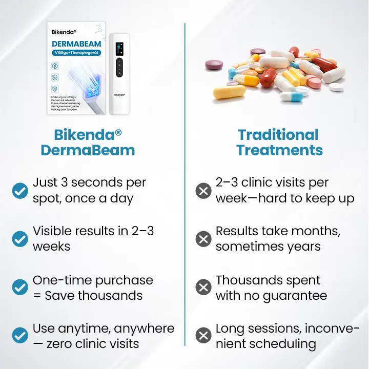 בשונה מטיפולים מסורתיים הדורשים ביקורים תכופים במרפאה וזמני החלמה ארוכים, Bikenda® DermaBeam דורש רק כמה דקות מדי יום – עם שיפורים גלויים תוך שבועות בלבד. בין אם אתה מחפש לשחזר את גוון העור או לנהל תסמיני ויטיליגו חוזרים, הוא מציע פתרון פשוט, יעיל,