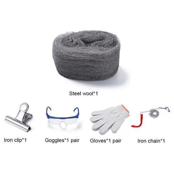 1 גליל צמר פלדה, מטרפה, חוט גמיש וצבת, מצית או גפרורים